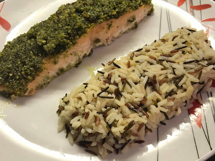 Pour 2 personnes. 20 minutes de préparation. Ingrédients : - 2 pavés de saumon - 2 c.à soupe de Pesto - 2 c.à soupe chapelure - jus de...